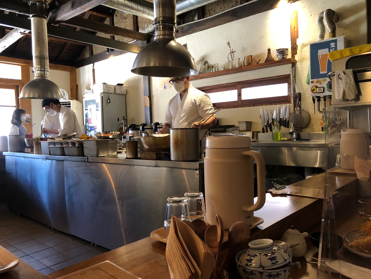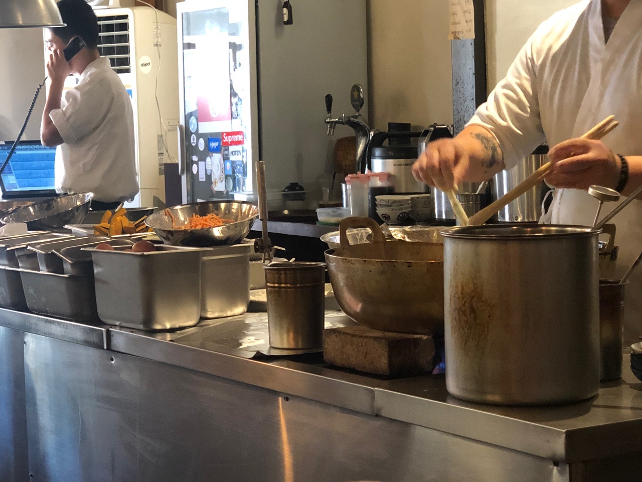 입장해서 들어가 보면 내부는 디귿자 형태의 바 테이블로 구성되어있습니다. 중앙에 조리하는 모습을 바로 볼 수 있는 오픈 키친이 있고 바로바로 주문이 들어가면 요리사분들이 튀김을 만들어 주십니다. 바 자리에 사람이 꽉 차서 전체 모습은 찍지 못했지만... 자리가 넓지는 않아요. 일본 골목의 식당들처럼 쭉~ 붙어 앉아있는 형태입니다. 코로나 이후에는 그래도 투명 가림막이 설치되어있었습니다.