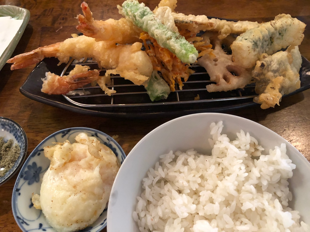 먼저 기본으로 세팅되는 튀김 접시...? 일단 빈 접시를 주시고 튀김이 갓 나오면 바로 올려주십니다. 밥과 장국 그리고 소금을 찍어먹는 간장이 나옵니다. 따로 나오는 것 이외에도 바질 레몬 소금도 있어서 깔끔한 튀김을 찍어먹으면 조합이 너무나 좋습니다. 소금은 앞에 종지에 따로 덜어먹을 수 있는 형태입니다. (사진이 없네요...ㅠㅠ)