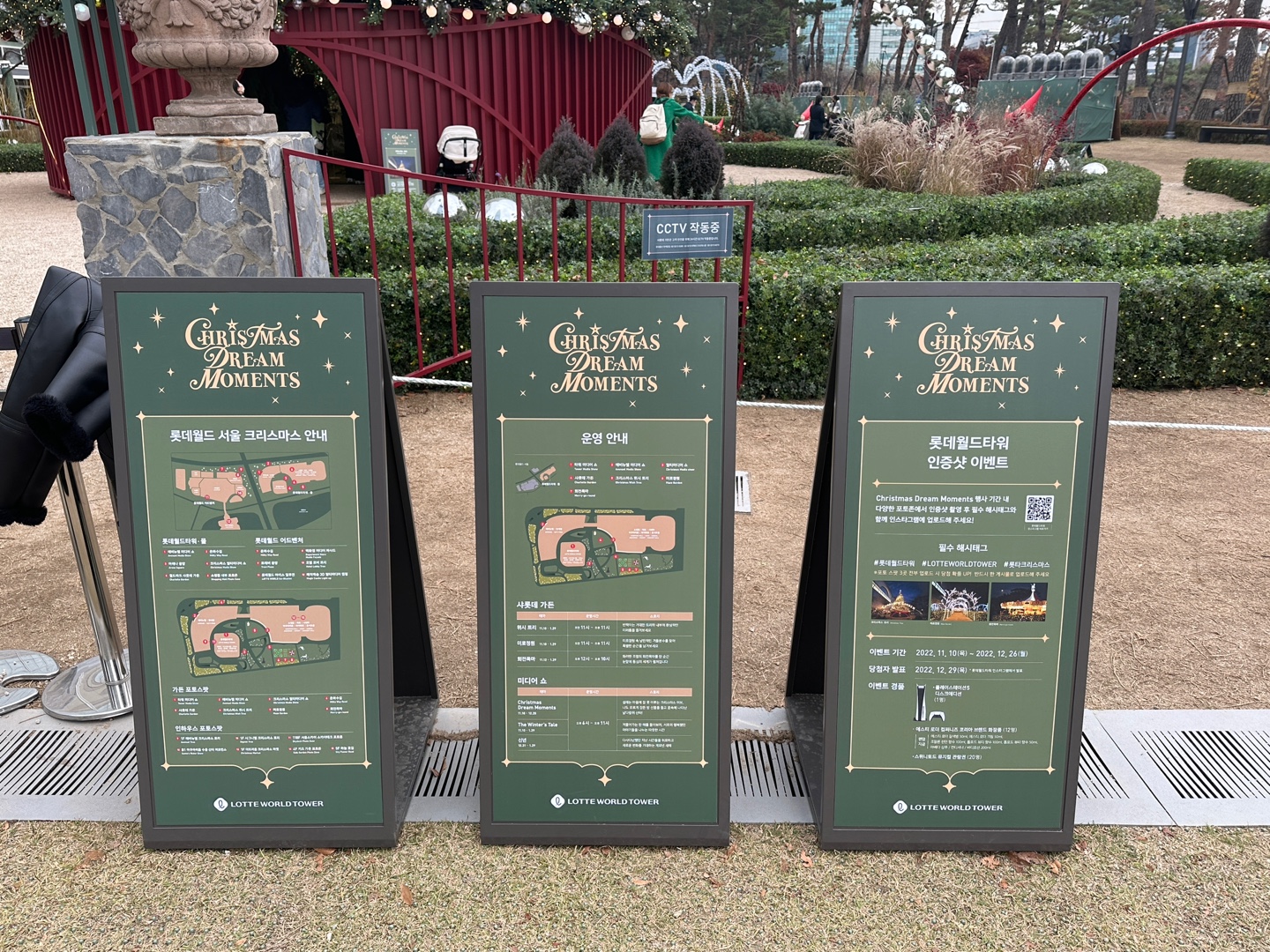 잠실 롯데몰의 크리스마스 이벤트 이름은 '크리스마스 드림 모먼츠'입니다. 석촌호수 동호 앞쪽, 롯데몰 바로 앞에 위치하고 있고요 들어가실 때 이런 입장 안내와 운영 안내가 적혀있습니다.