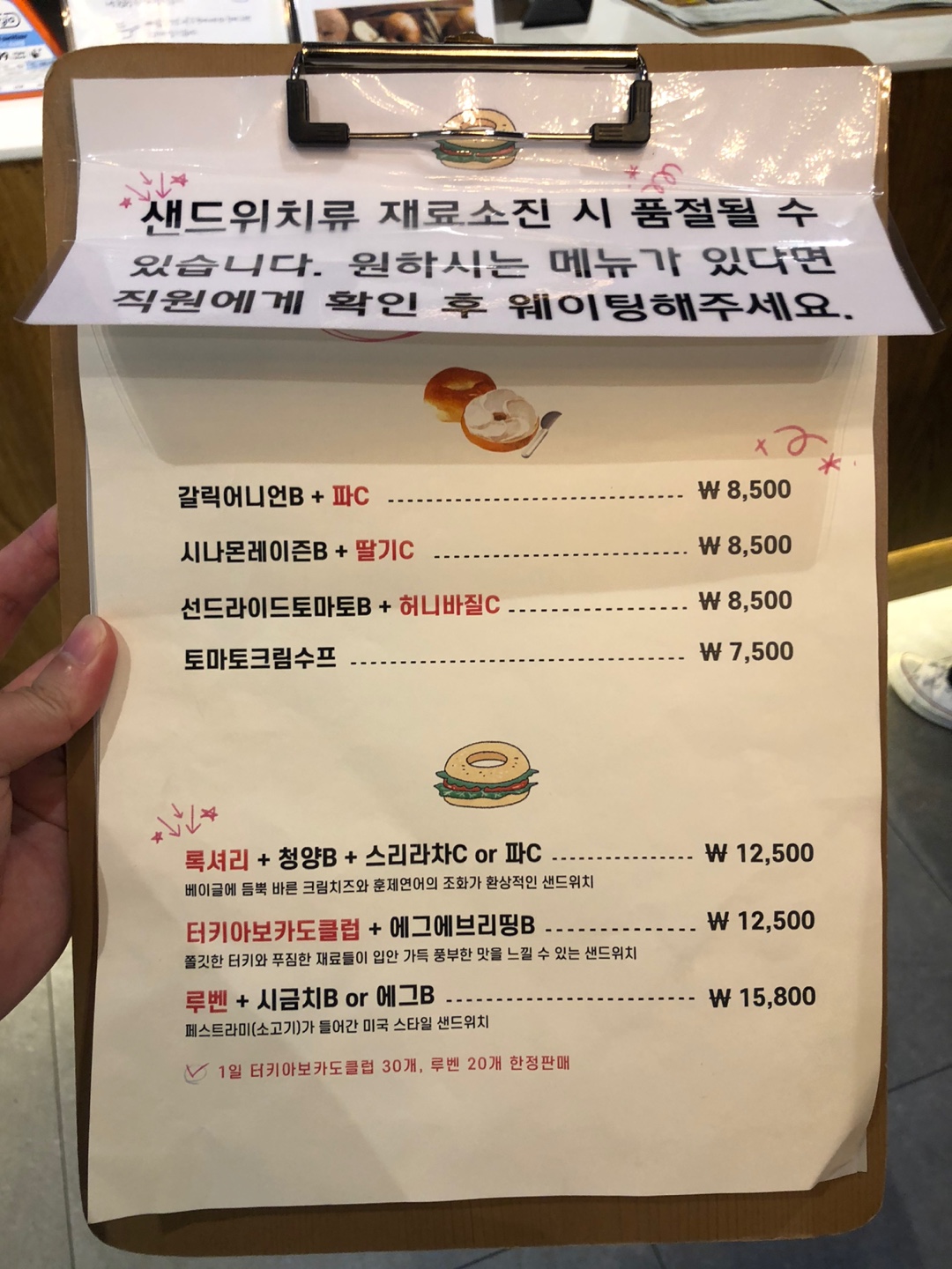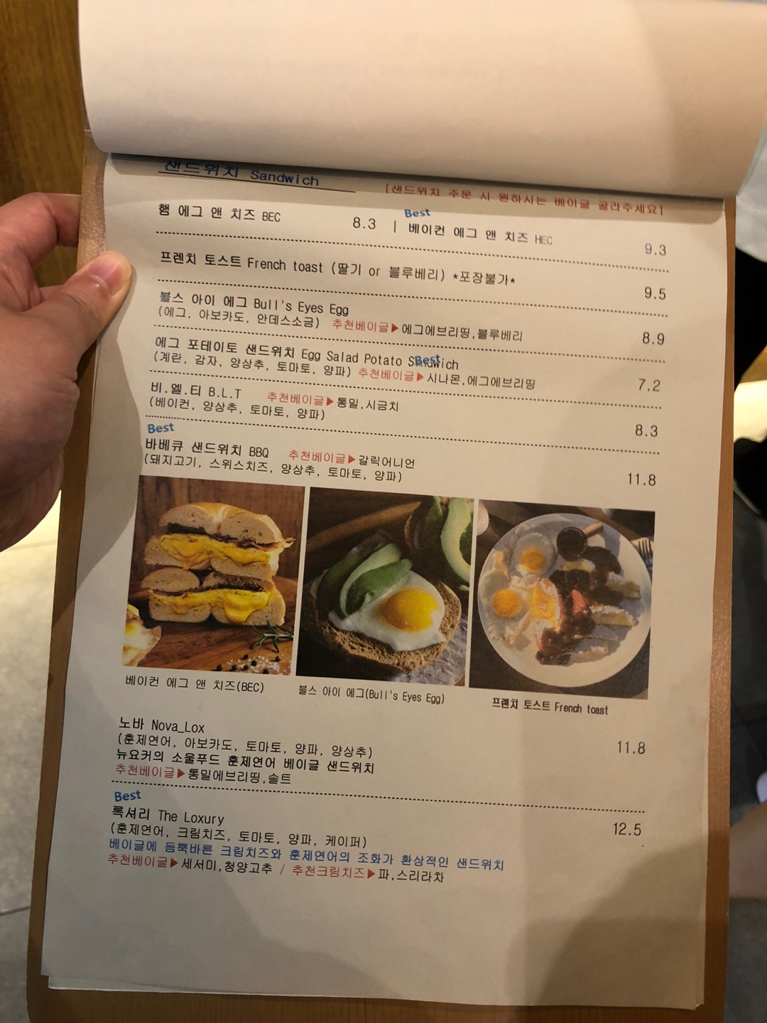 훈제연어도 듬뿍, 크림치즈도 듬뿍! 이게 뉴욕스타일인가.. 생각했습니다. ㅎㅎㅎ (뉴욕 스타일을 글로 배웠네요. 못 가봐서. ㅠㅠ ㅋㅋㅋ) 이게 종류가 워낙 많다 보니 어떤 걸 골라야 할지 고민이 되는데, 메뉴에 추천 베이글이 적혀있어서 처음 가는 사람에게 고민의 시간을 좀 줄여주는 것 같았습니다. 록셔리에는 사실 세서미나 청양고추 베이글을 추천한다고 적혀있는데 저는 노바 샌드위치에 추천되어있는 에브리띵베이글을 선택했고요, 크림치즈는 추천을 따라 파로 주문했습니다.