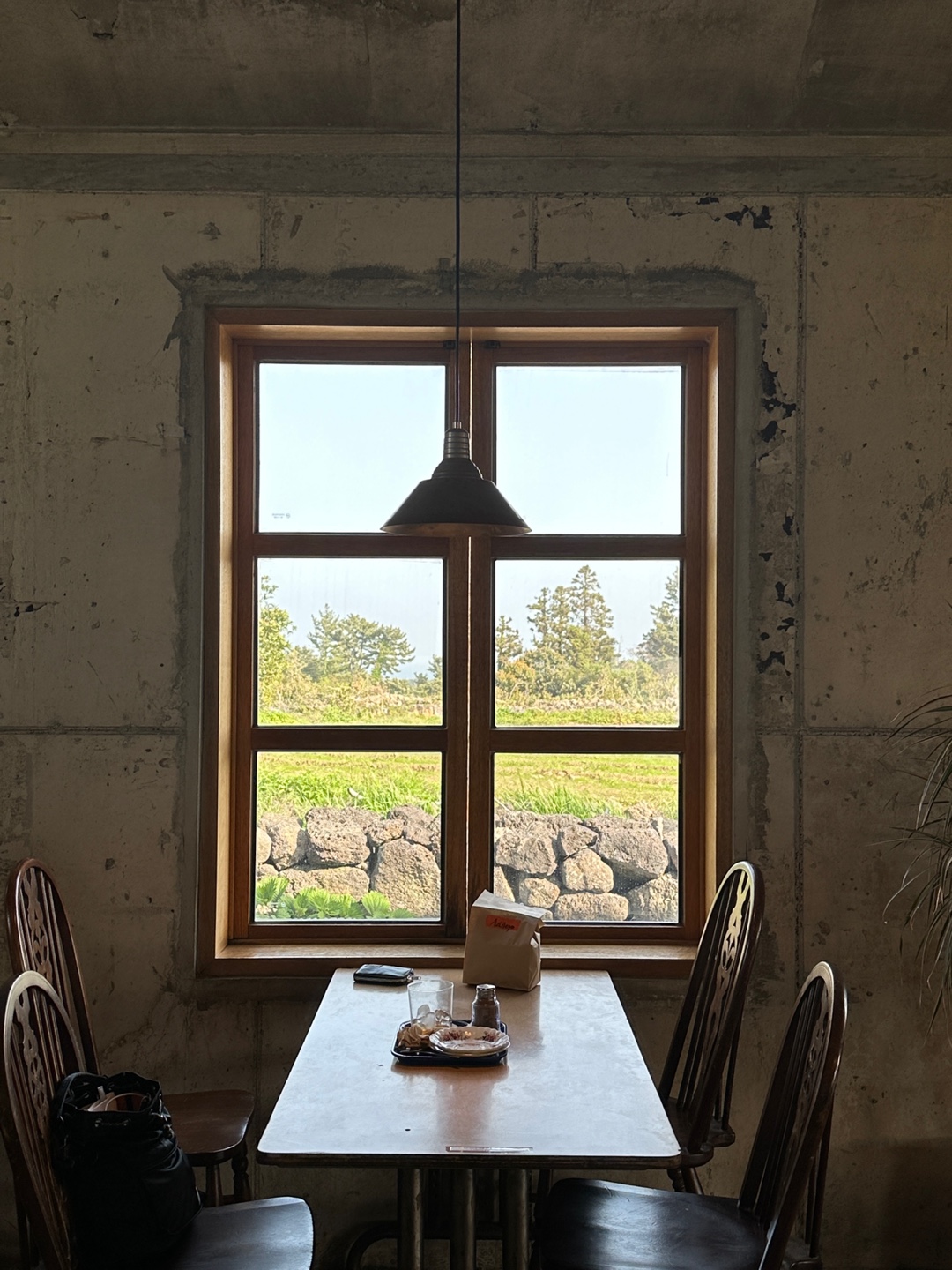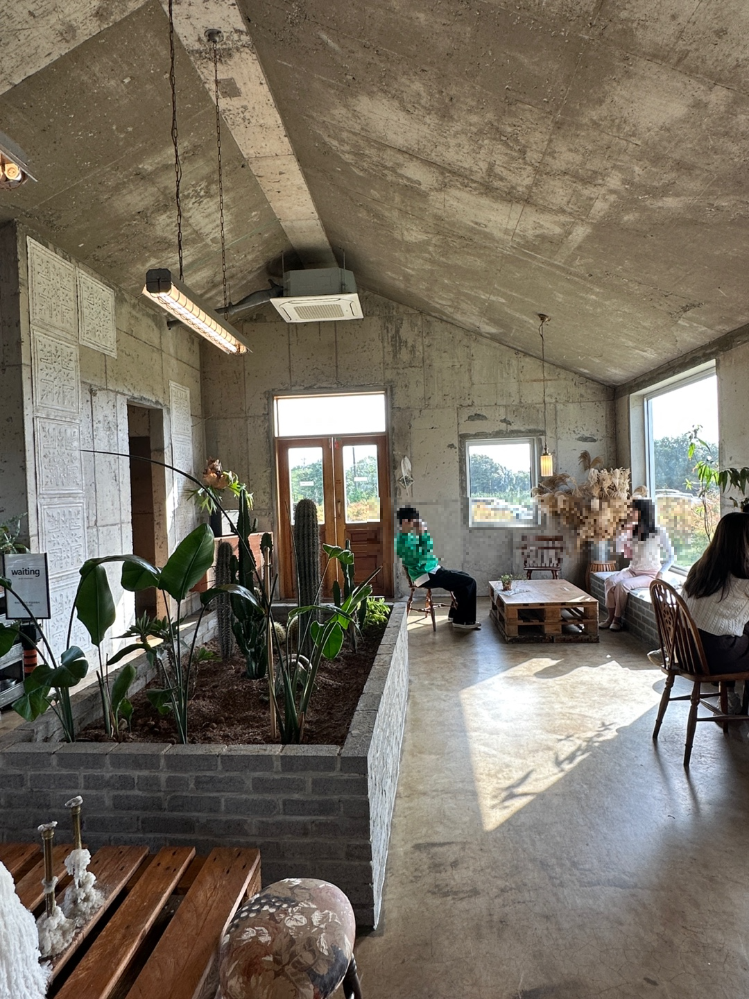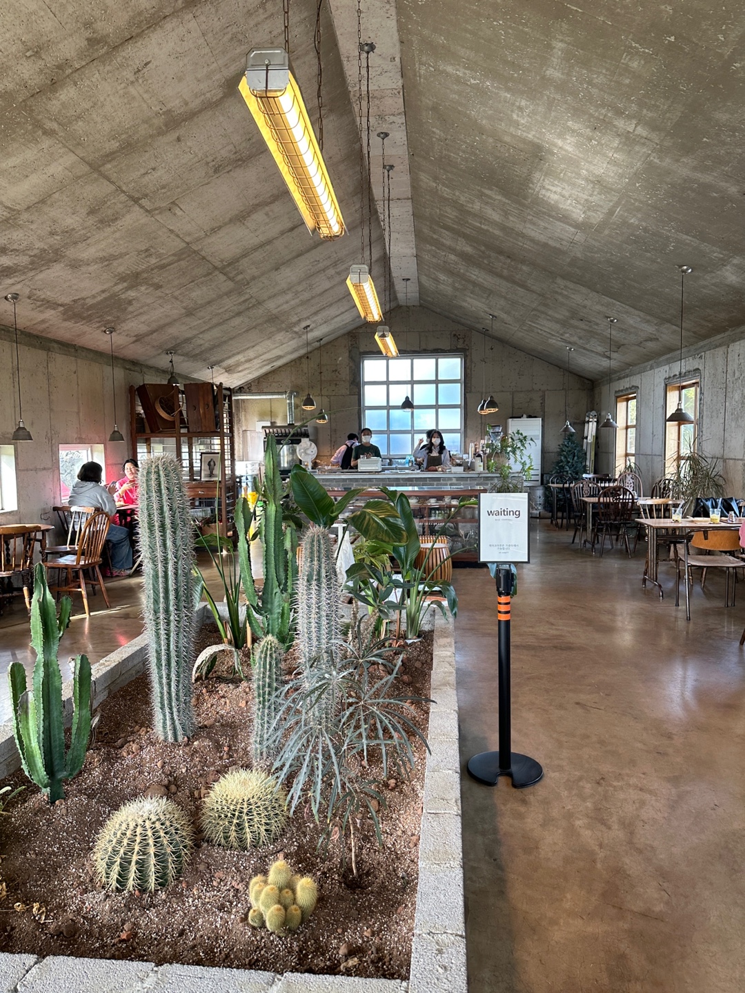 카페 내부는 이렇게 생겼어요. 앉아서 먹을 수 있는 자리도 꽤 있고, 풍경도 좋아서 시간이 있다면 먹고 가시는 것도 좋을 것 같았습니다. 가운데는 선인장이랑 식물들이 귀엽게 식재되어 있었고, 벽면은 투박하게 처리되어 있지만, 나머지 소품들이 우드우드해서 조화가 좋았던 것 같습니다.