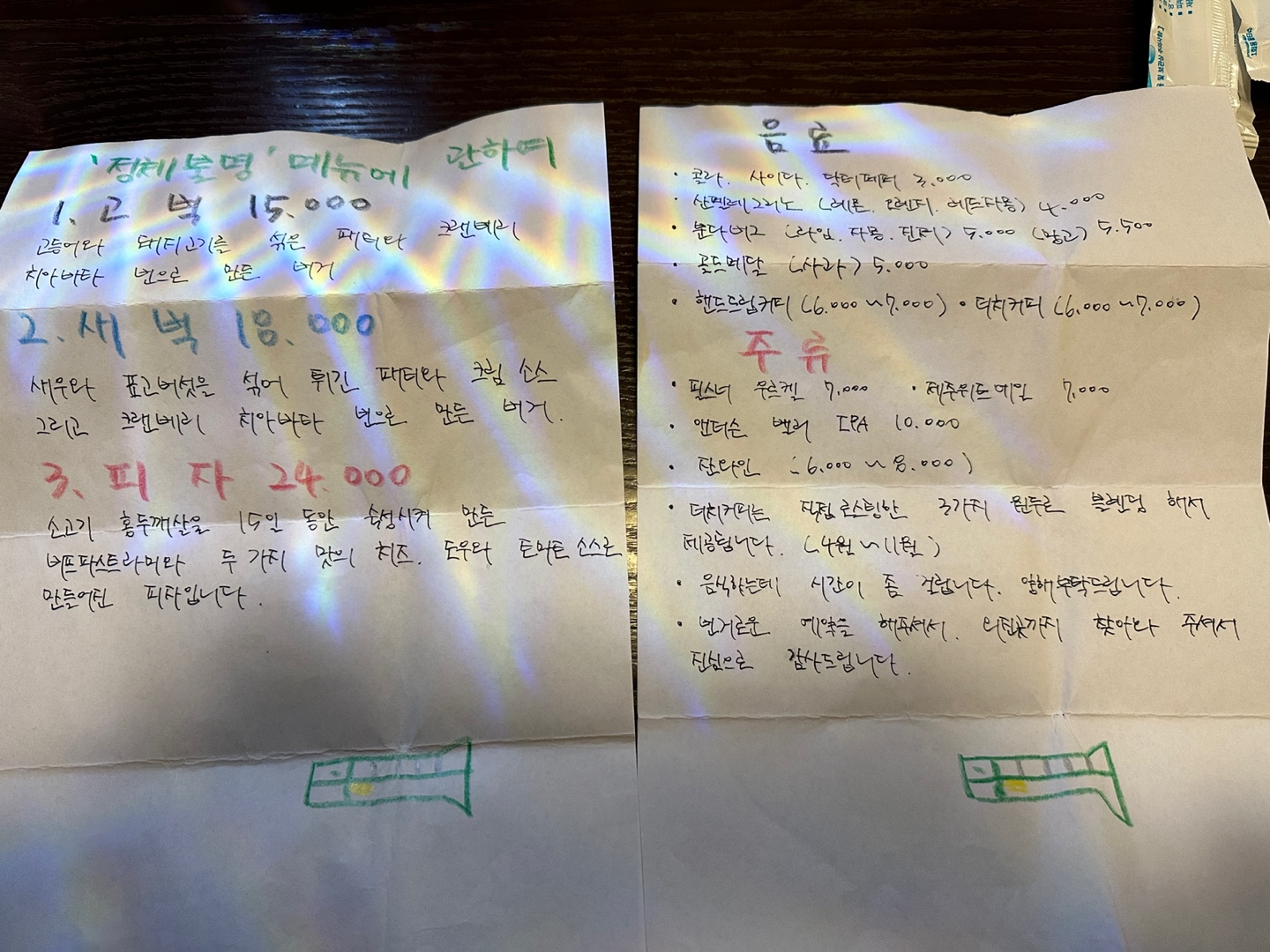 저희는 2인이라 가장 작은 테이블이 준비된 룸으로 들어온 것 같고요, 최대 6인까지 식사가 가능하다고 합니다. 소품들이 하나하나 특이했어요. 메뉴는 저기 봉투 안에 들어있더라고요. ㅎㅎㅎ