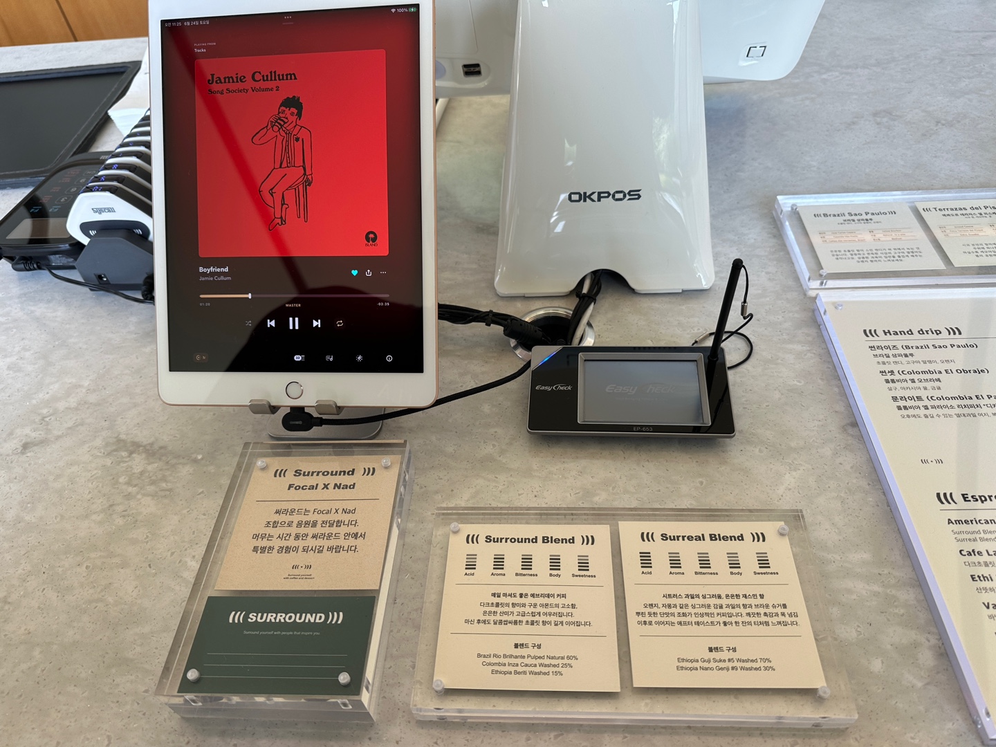 써라운드라는 카페의 이름처럼 2층의 surround.zip은 예약 후 음악을 감상할 수 있는 곳으로 공간이 구성되어 있습니다. 네이버로 예약을 받고 2시간당 2만원에 운영되는 100% 예약제라서 음악을 좋아하시는 분들은 예약하시고 고요하고 아름다운 뷰와 제공되는 필터커피 1잔과 디저트를 즐기면서 시간을 보내시면 좋을 것 같아요!
