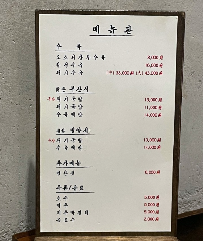 자리를 잡고 메뉴판을 봅니다. 메뉴는 심플합니다. 부산식 맑은 돼지국밥과 밀양식 진한 돼지국밥이 준비되어 있고, 수육도 따로 주문할 수 있습니다. 지난번 수영구에 있는 매장에 갔을 때는 수육백반을 하나 시켜서 먹어봤는데, 이번에는 밀양식 하나 부산식 하나 모두 돼지국밥으로 주문해 보았습니다.