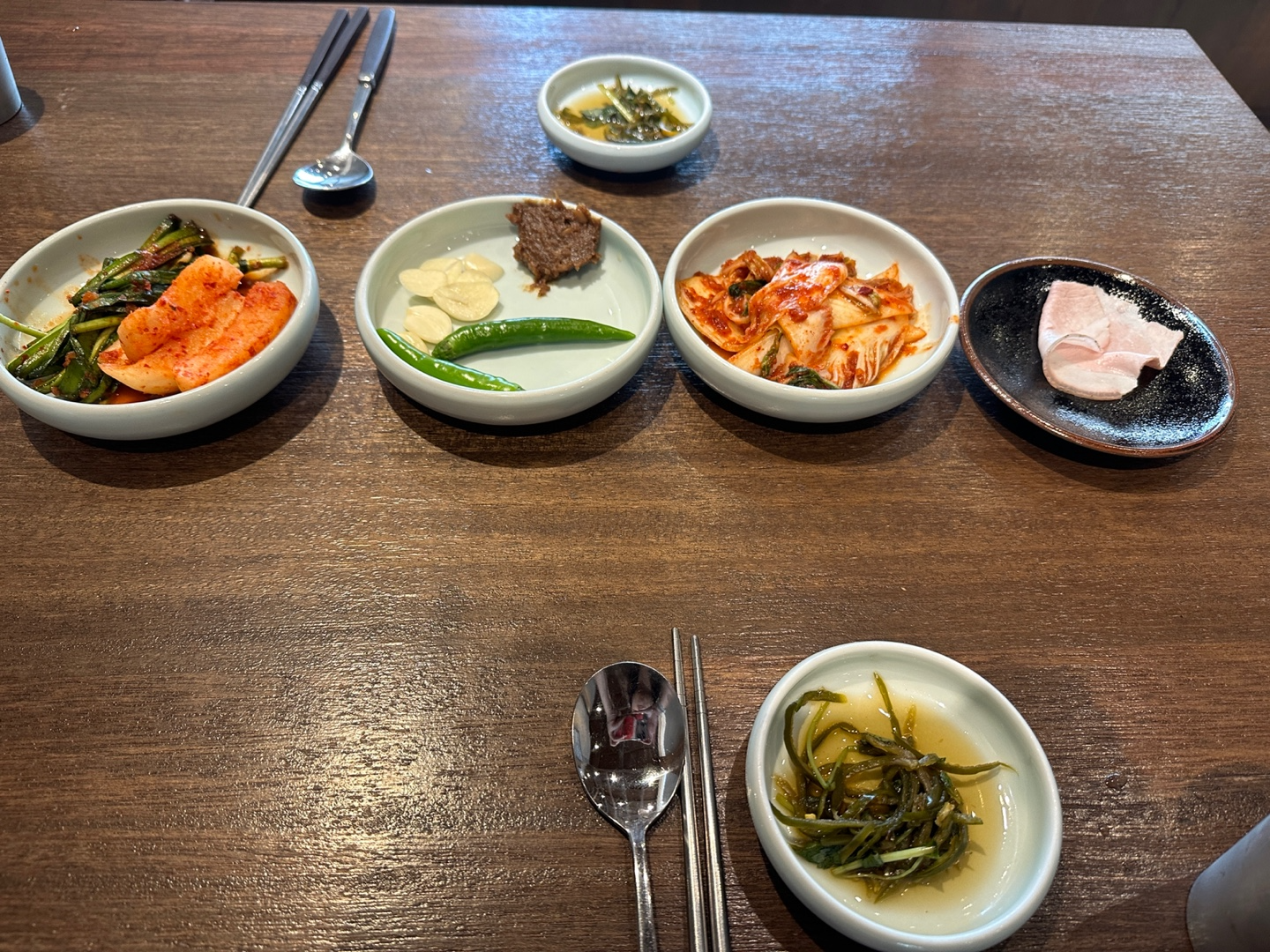 주문하면 나오는 밑반찬입니다. 아주 심플한데 전부 다 깔끔한 맛이라 좋았습니다. 김치도 깔끔하고 앞에 함께 나오는 고기 찍어먹는 장이 새콤하고 개운하게 해 줘서 정말 제 취향이었습니다.