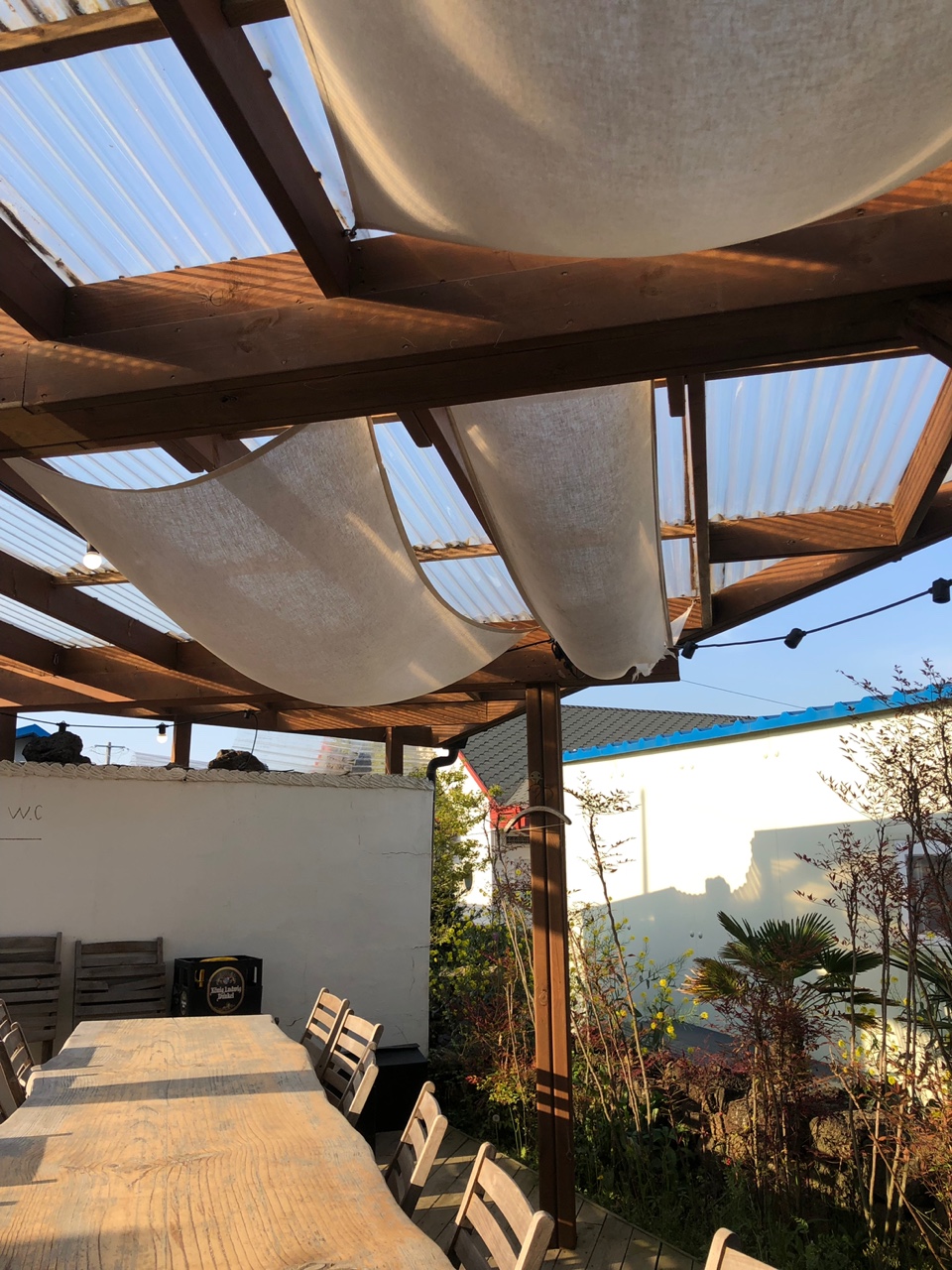 귀여운 식당을 보고 바로 돌진하시면 입구가 없고요, 뒤쪽으로 돌아서 들어가도록 되어 있습니다. 그리고 뒷편 입구쪽에도 커다란 야외 테이블이 있는데, 여기서도 식사가 가능할 것 처럼 보이는데... 웨이팅 전용인지 식사까지 가능한 곳인지는 정확하지가 않네요. ㅠㅠ