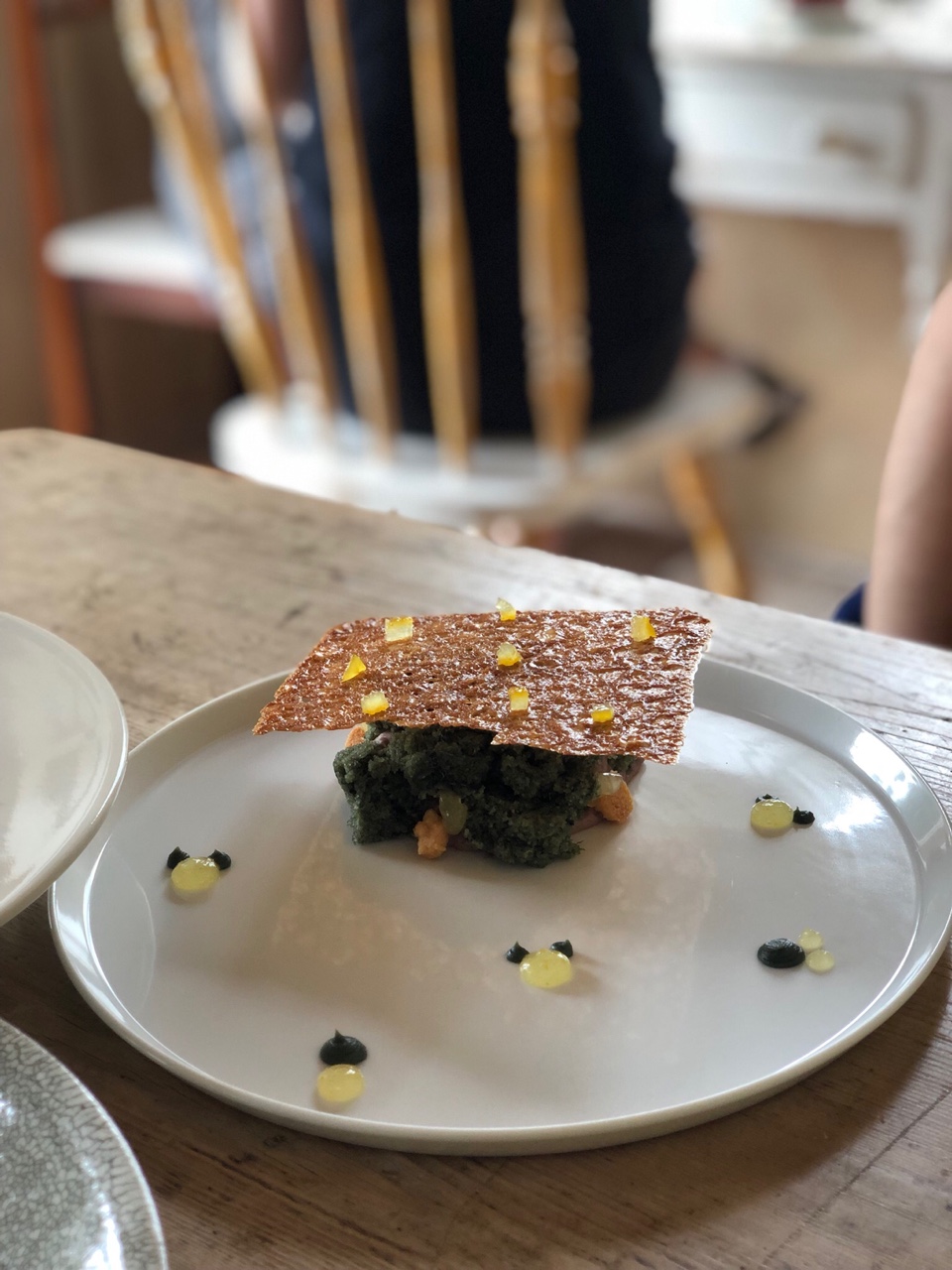 원래 쑥을 별로 안 좋아해서 가장 기대하지 않았는데 상큼한 유자와 함께했을 때 조합이 너무 좋았고, 튀일까지 같이 먹을 때 정말 맛있더라고요! 그리고 up이라는 메뉴는 주악이 들어가는데 주악이라는 음식을 처음 먹어보았는데 떡과 찹쌀도넛의 중간 느낌으로 씹는 맛이 좋았어요. 아이스크림과도 정말 잘 어울렸습니다.