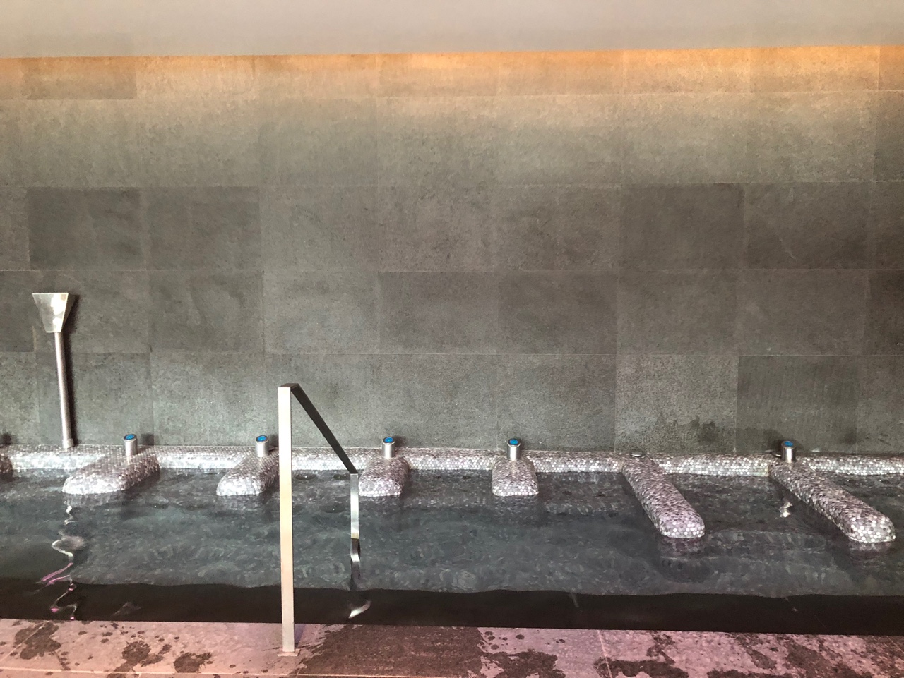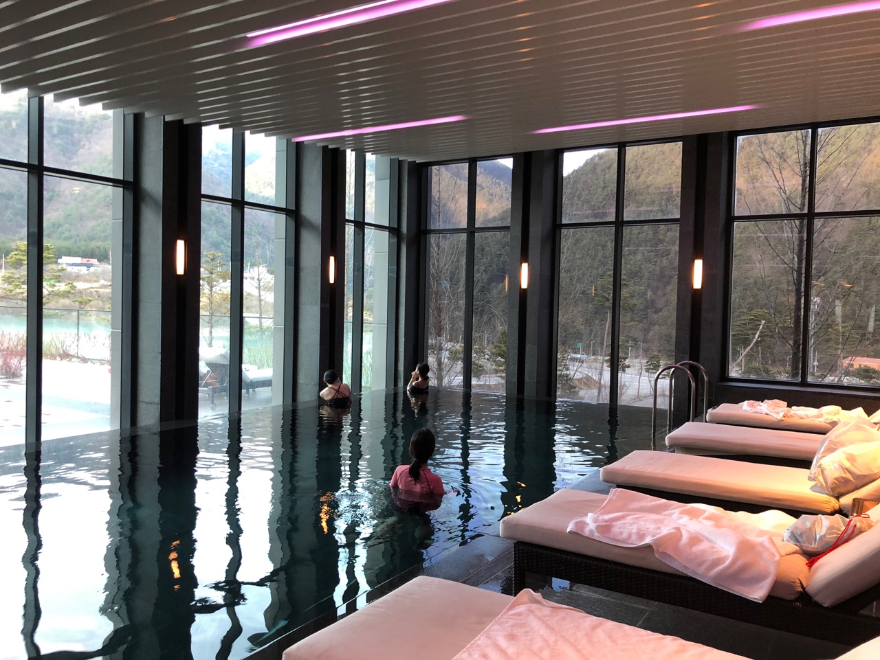 꽤 긴 시간 이용할 수 있는 실내 수영장이 있고, 수영장 뒤쪽으로는 물을 이용한 다양한 셀프 마사지를 즐길 수 있는 공간이 있습니다.