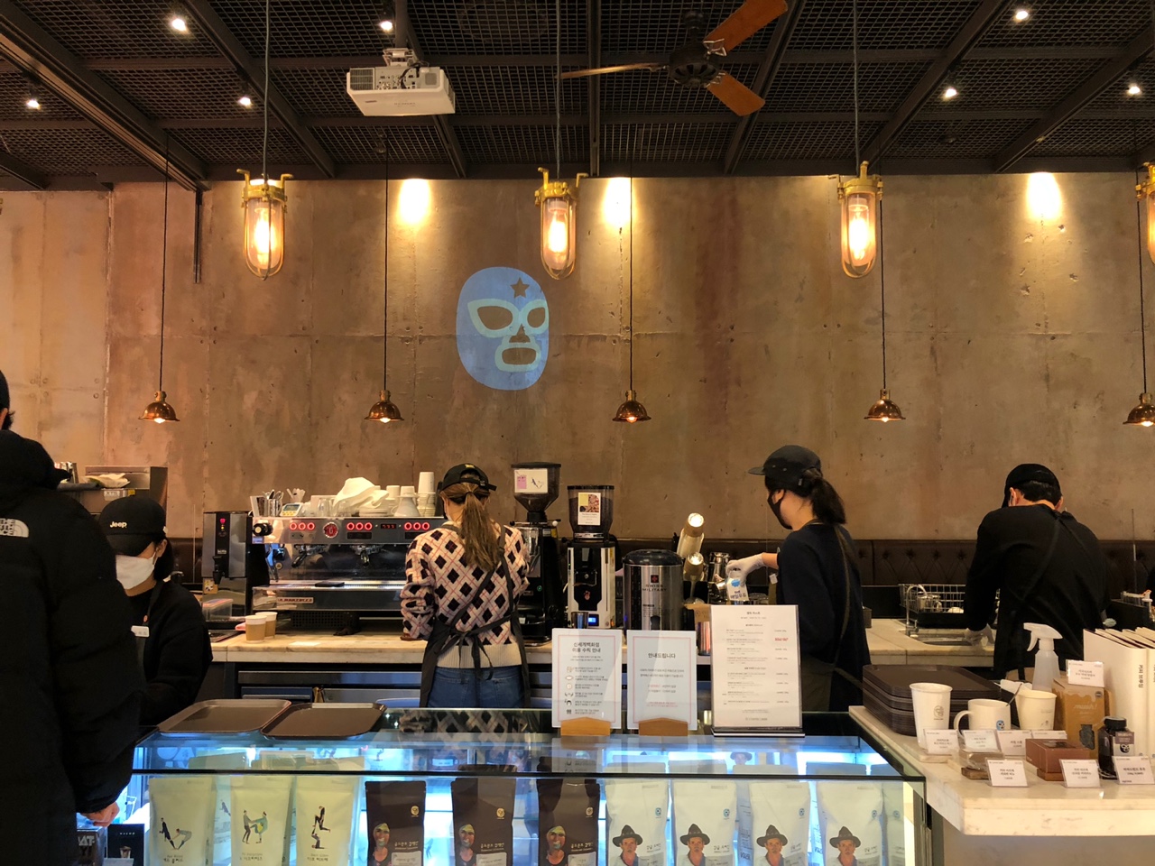 하프커피 말고 다른 커피 전문점을 하나 더 소개해 드리려고 합니다. 이 카페는 파미에스테이션 안에 있는 곳은 아니고요 지하 분수광장에서 신세계백화점 왼쪽 길로 들어서면 찾으실 수 있습니다. 메가박스 가는 길이라고 말씀드리면 좀 더 이해가 쉬우실까 모르겠네요. ㅎㅎ파란색 타이거마스크? 같은 대표 캐릭터가 한번 보면 잊히지 않는 카페인데요, 스페셜티 커피로 매우 유명한 곳입니다.이곳 역시 연남동, 명동 등 다양한 곳에 매장이 있으니 가까운 곳으로 방문해서 경험해 보시면 좋을 것 같아요.