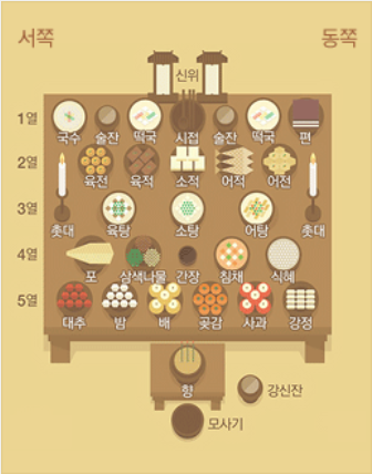 지역마다 차례상 차리는 방법에 조금씩 차이가 있기는 하지만 보통 5열로 지내고 기본적인 방식은 비슷하게 가져갑니다.