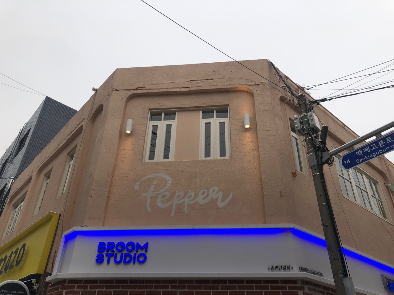 2층에 있어서 처음에 들어가는 입구를 찾기 애매할 수 있는데, 송리단길을 따라 내려오다 보면 오른쪽 편에 핑크색으로 예쁘게 칠해져 있는 2층 벽면을 보실 수 있을 거예요.