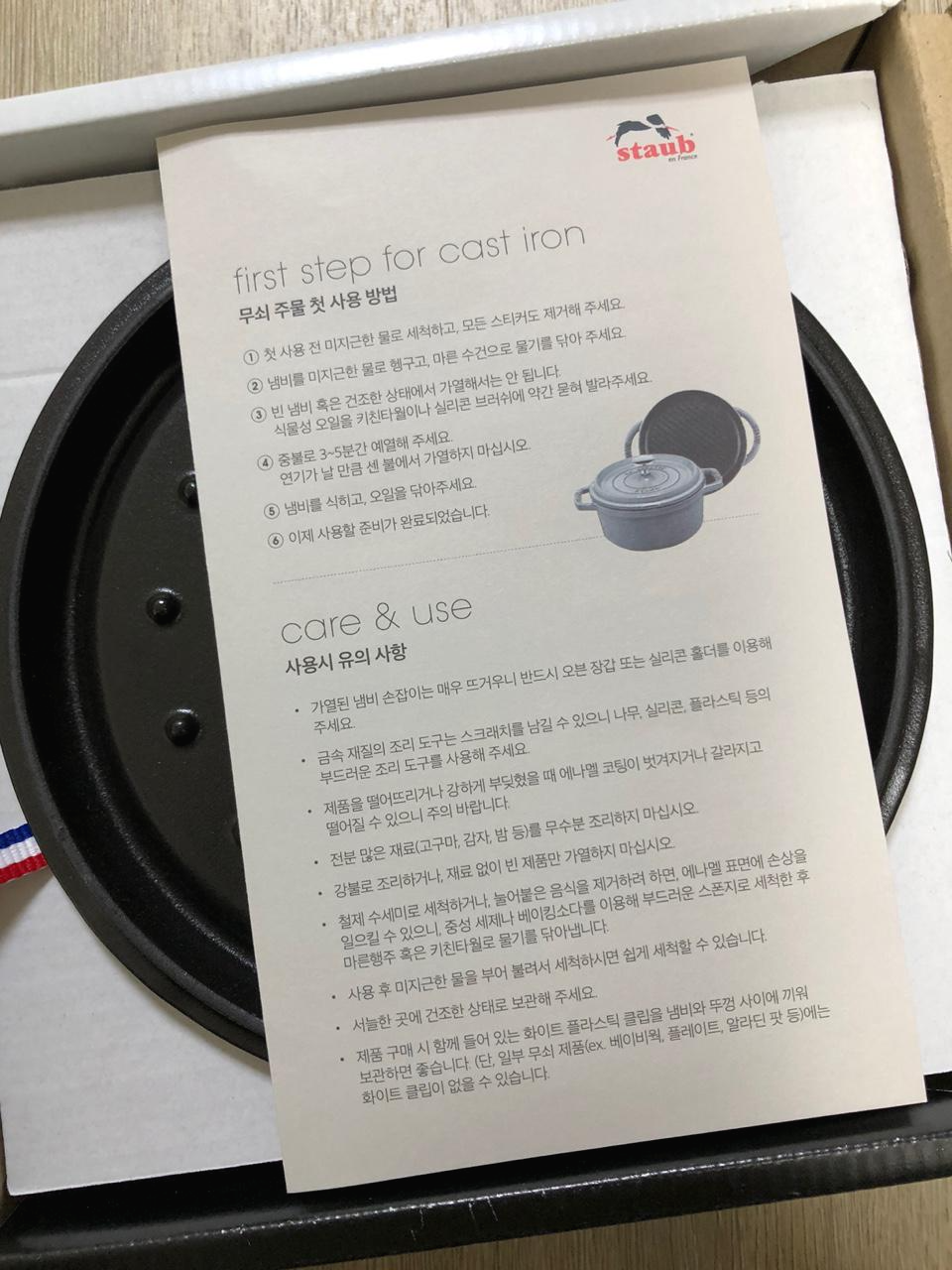 이전 포스팅에서 설명드린 거처럼 스타우브는 무쇠 주물냄비지만 에나멜 코팅이 되어있어서 녹슬 걱정이 덜하긴 하지만, 첫 사용에서는 시즈닝을 해주는 게 좋다고 해서 저도 시즈닝을 해주게 됩니다.