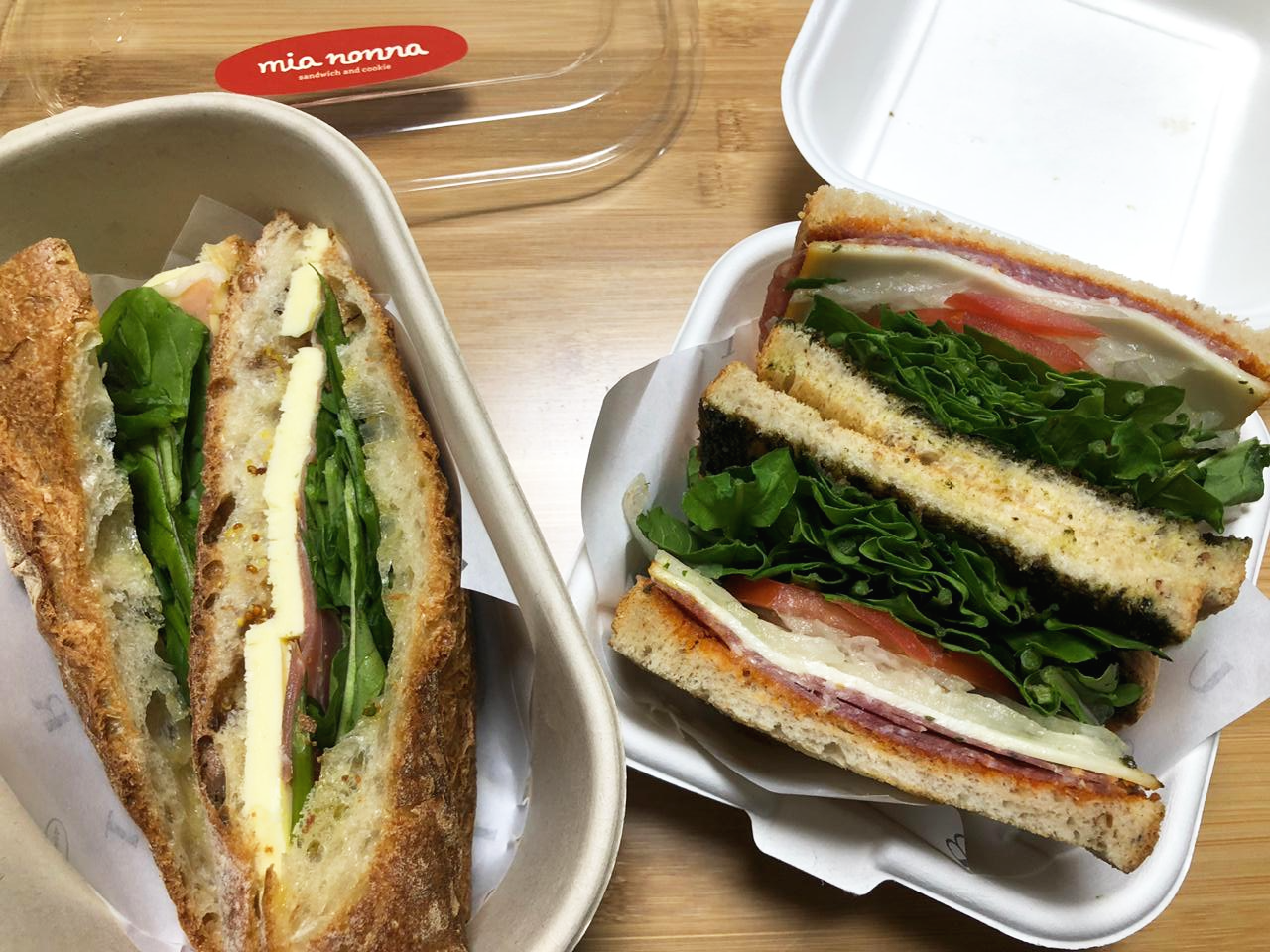 그리고 미아논나 S.R.T는 살라미, 루꼴라, 토마토가 들어간 샌드위치인데, 맛없을 수 없는 조합이지 않나요? ㅎㅎ 루꼴라 잔뜩 넣어주셔서 너무 좋았습니다. 밸런스 좋고 쑥쑥 들어갑니다. 그리고 식빵 면에 다르게 발라져 있는 토마토선드라이 소스와 바질페스토 소스가 또 중요한 역할을 하는 것 같았습니다. 아래 크게 찍어둔 사진 보면 샌드위치 곡물 식빵 안쪽 면의 컬러가 다른 걸 보실 수 있을거에요!