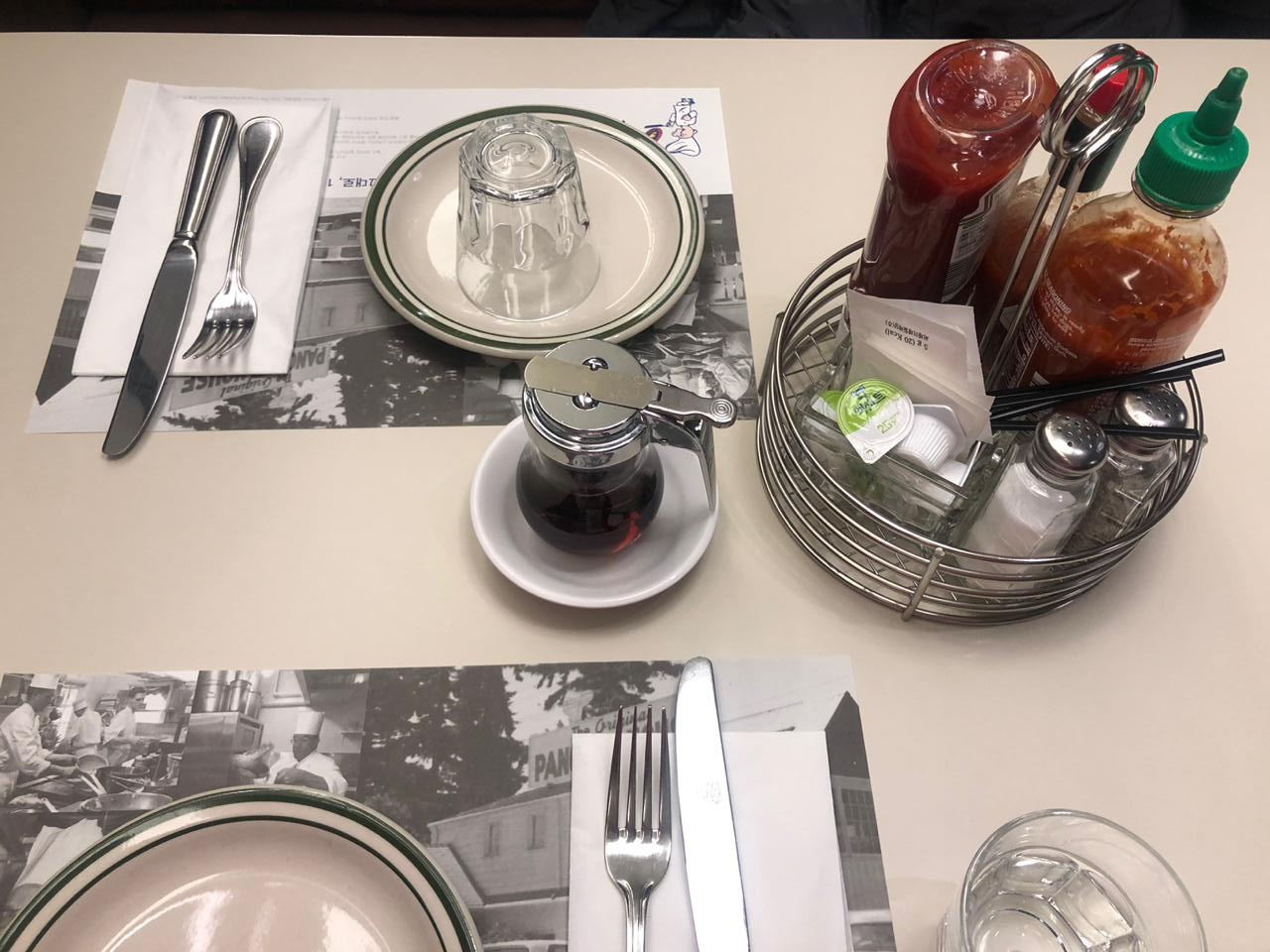 미리 세팅되어있는 메이플시럽과, 케첩 등 다양한 소스류. 이렇게 메이플 시럽을 아끼지 않고 각 테이블에 주는 것이 이곳의 포인트라면 포인트라고 할 수 있겠네요. 원하시는 만큼 눈치 볼 필요 없이 듬뿍 뿌려 드시기 바랍니다!