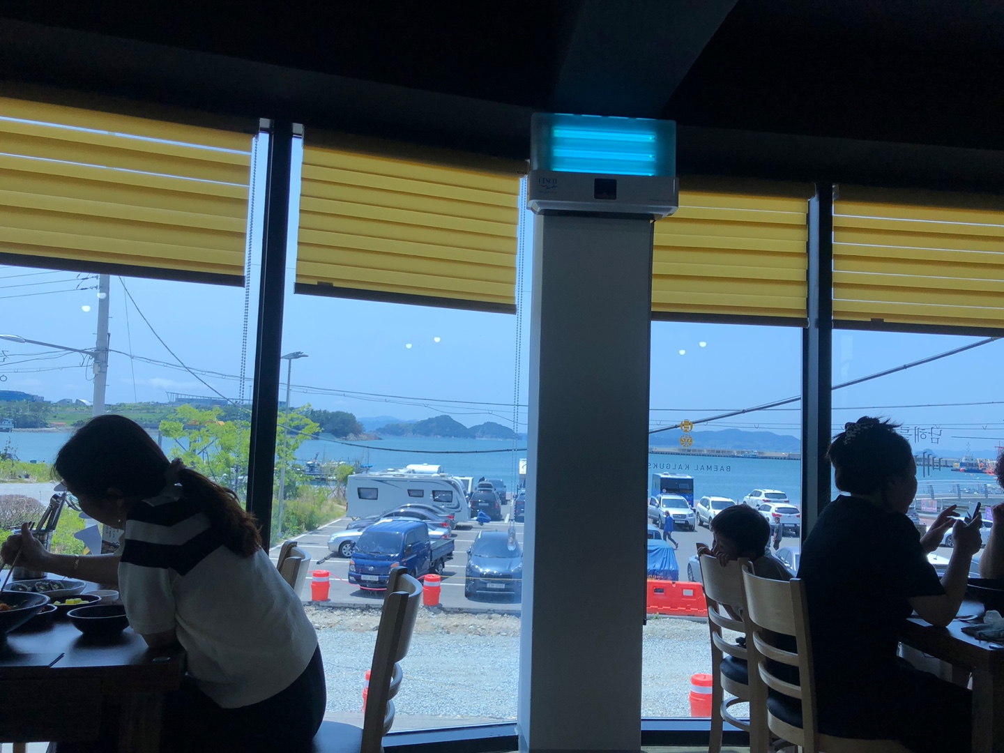 2층에 자리 잡았는데 창 밖으로 바다도 보이고 나름 느낌있고 좋았습니다. ㅎㅎ 사진에서 보이시죠? 주차 공간은 넉넉합니다.