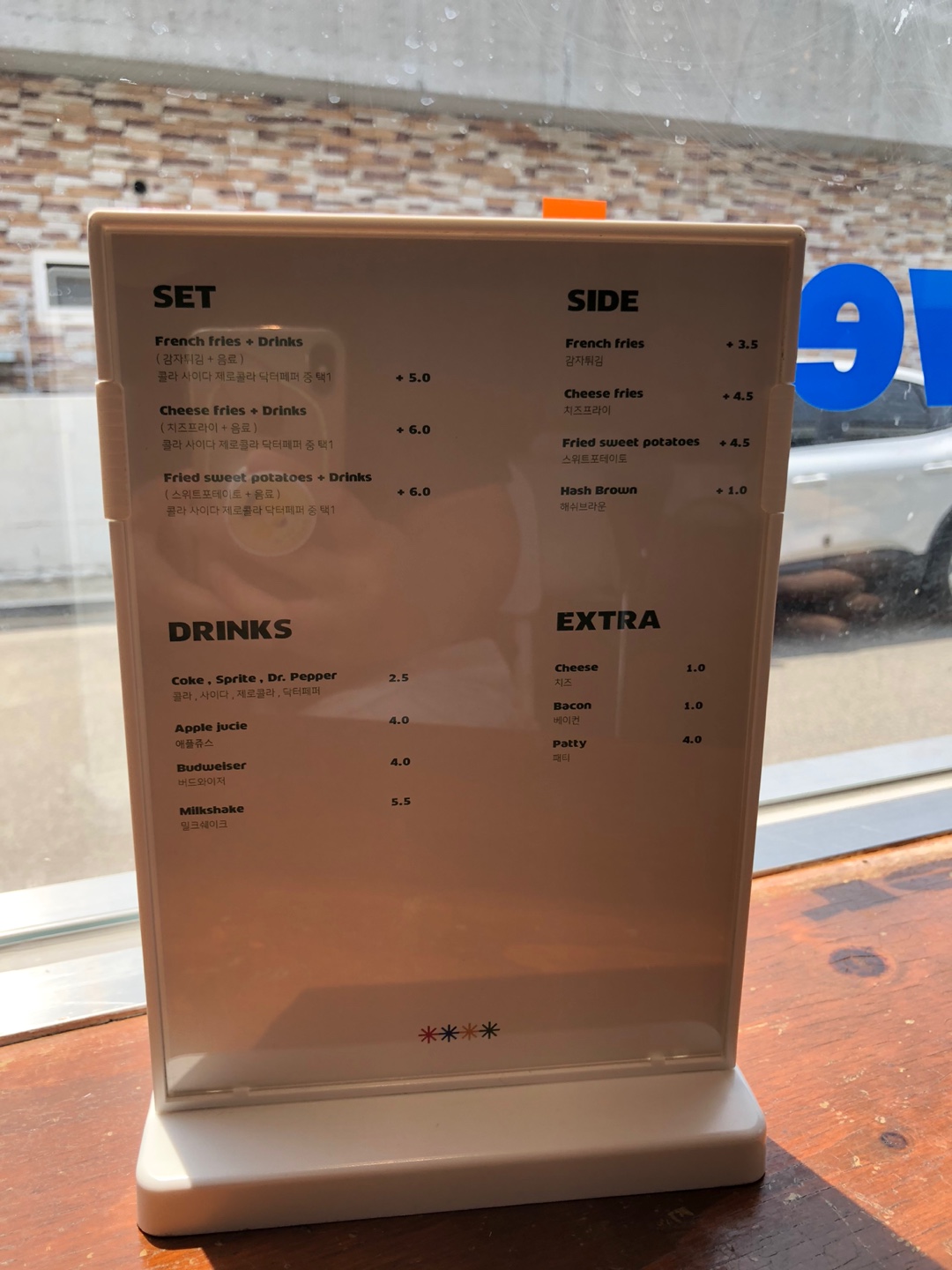 4명 자리가 없어서 바 자리에 앉아 메뉴를 탐독해 봅니다. 저는 항상 새로운 곳에 오면 클래식이나 시그니처 메뉴를 먹어야 한다고 생각하기 때문에 ㅎㅎㅎㅎ 클래식버거를 주문했습니다. 다른 일행은 덕둔버거, 베이컨 치즈버거 이렇게 다양하게 주문했던 기억입니다. 그리고 세트 주문으로 감자튀김도 물론 챙겼습니다! 세트 가격도 있으니 참고해 주세요.