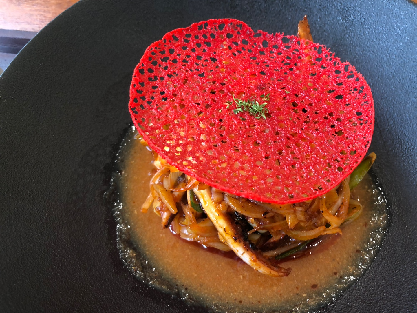 비스크 오징어에는 이렇게 빨간색으로 튀김도 올라가 있어서 미적으로도 아주 예쁘더라고요. 레스토랑 음식 같고. ㅎㅎㅎ