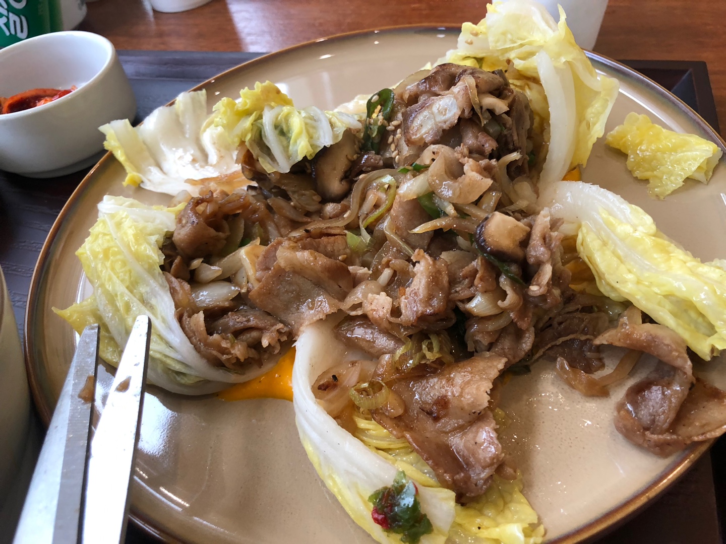 주문한 메뉴는 비스크 오징어 / 배추 삼겹 / 간장새우였습니다. 한상 음식이라 모두 동일하게 반찬 3가지와 국이 나오고 메인 메뉴만 다른 형태입니다.