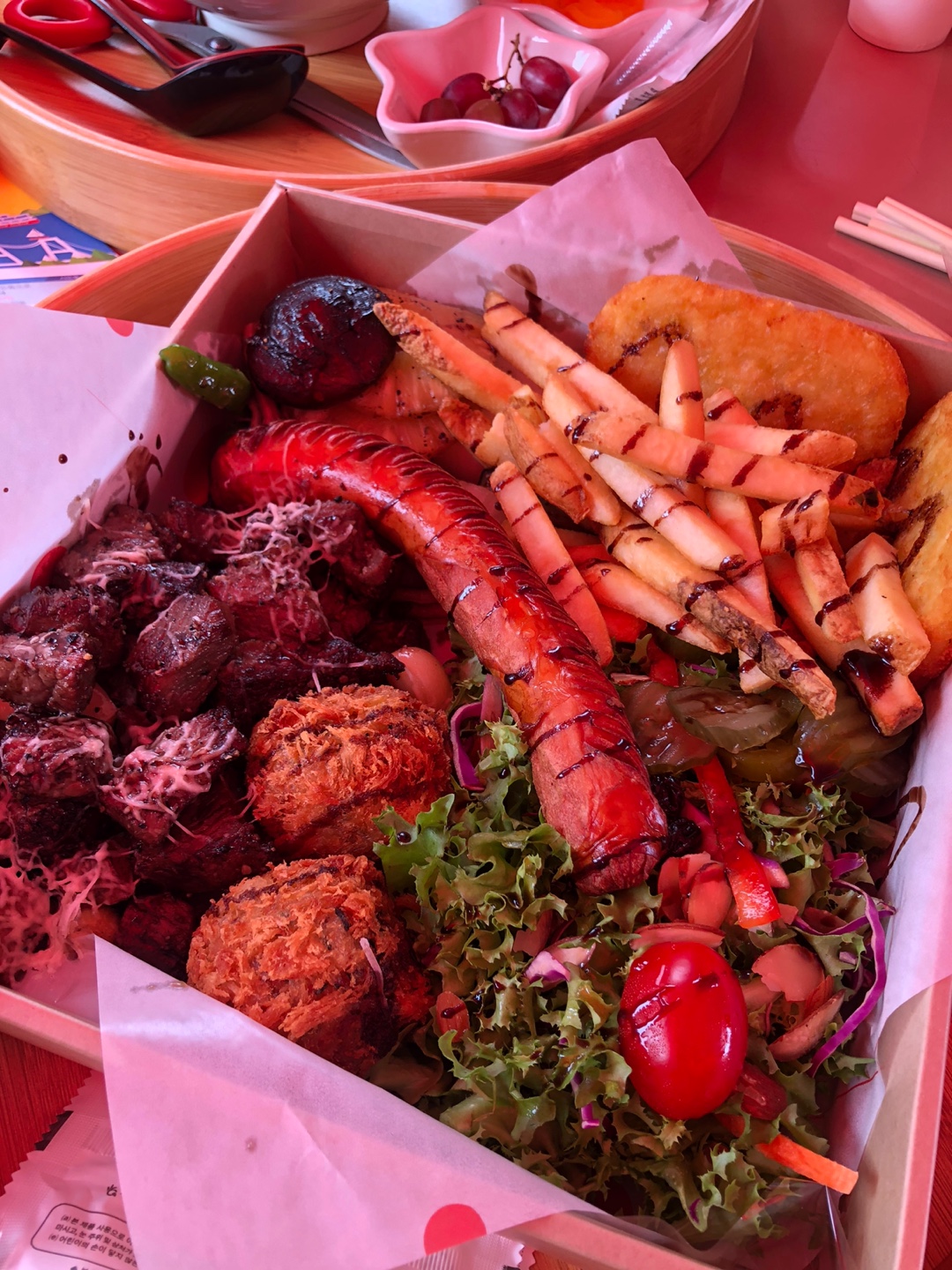 짬뽕에는 해산물이 정말 가득 들어있었는데, 비쌀만하다... 싶은 느낌이었습니다. 국물도 아주 칼칼하고 해산물도 많아서 정말 맛있었어요.ㅎㅎ 그리고 스테이크박스는 가격이 좀 비싸다 싶었는데 양이 정말 많았고 다양하게 들어있어서 나눠먹기 좋은 것 같더라고요. 여러 명이 가면 같이 먹기 좋을 것 같습니다. 그리고 아란치니 같은 주먹밥 튀김도 들어있어서 든든했어요.