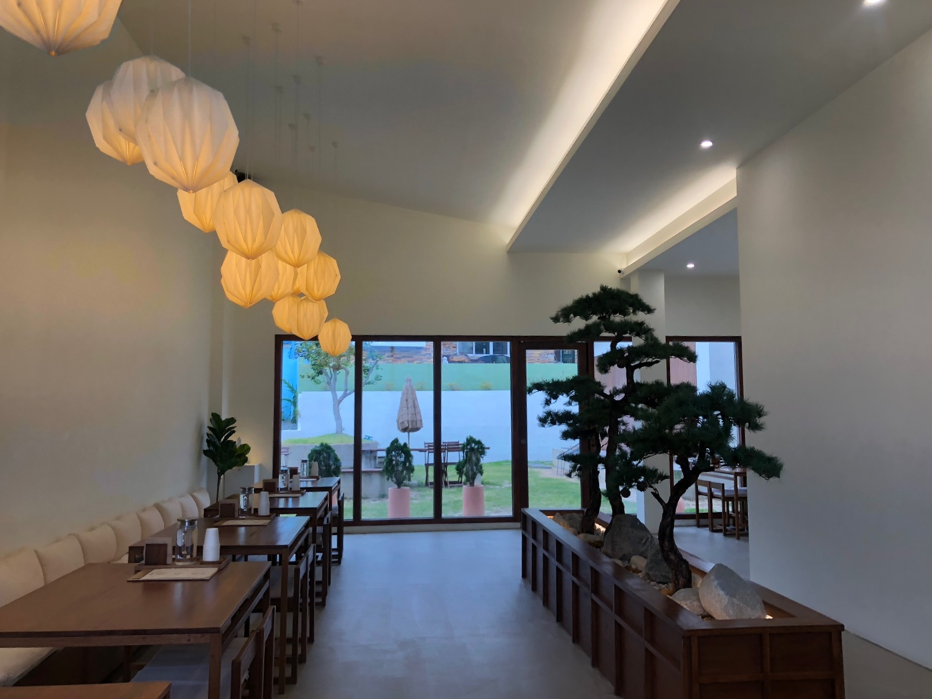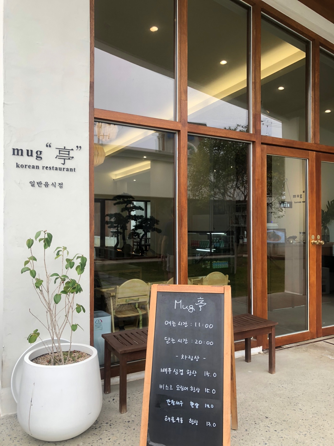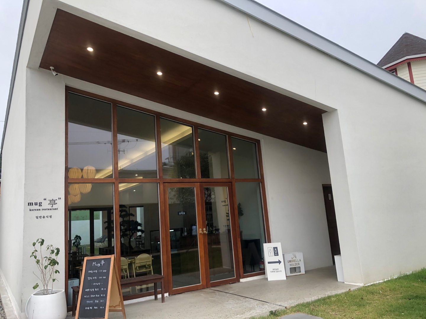 식당 외관이 화이트로 아주 모던하고 깔끔해요. 옆쪽으로 하얀 건물들이 무리 지어 같이 있는데 건물들 중 몇 곳은 숙소로 이용되고, 또 카페로 이용되는 곳도 있는 것 같더라고요. 시간이 없어서 카페는 가보지 못하고 머그정에서 식사만 해 보았습니다.