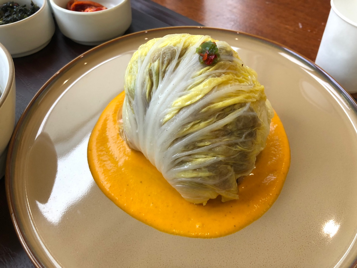 그리고 또 독특한 비주얼로 사로잡은 배추 삼겹은 배추 안에 대패삼겹살처럼 얇은 삼겹살이 들어있는데, 가위로 잘라서 펼쳐서 함께 먹는 형태였습니다. 아래쪽에 깔려 나오는 당근 무스와 함께 먹으면 밸런스도 잘 맞고 좋더라고요!