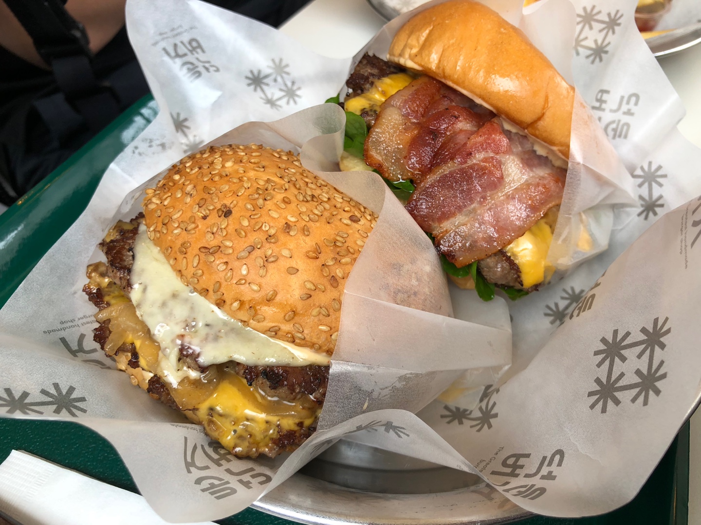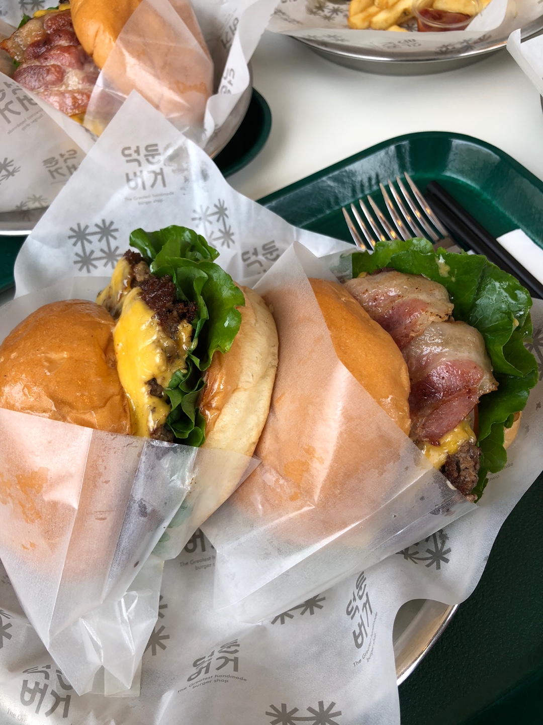 사진 순서대로 클래식 버거 / 베이컨 치즈 버거 / 덕둔버거 / 베이컨 치즈 버거입니다.