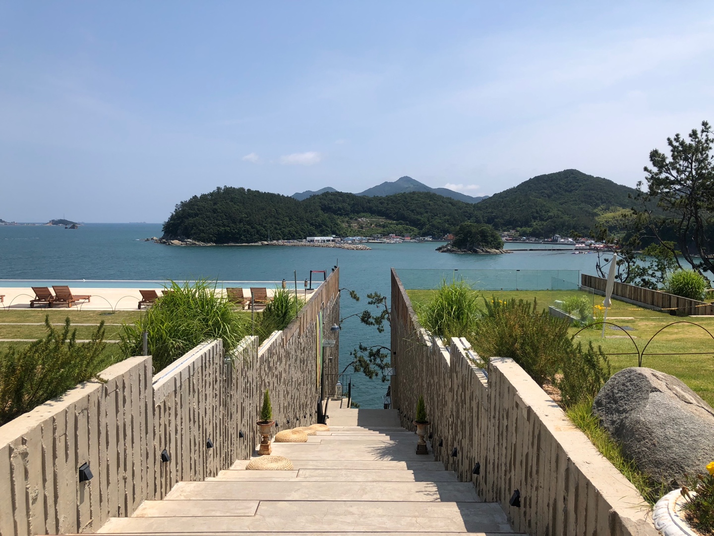 카페 입구로 들어가는 구조가 독특해요. 여기가 유명한 포토존인 것 같더라고요! 건물 위에 피크닉 존이 있고 계단 아래로 내려가면 카페로 들어가는 문이 있답니다. 그리고 양쪽 건물 사이로 바다가 샥! 보이는! 너무 예쁘더라고요! 사진 찍어도 잘 나와요 ㅎㅎㅎㅎ