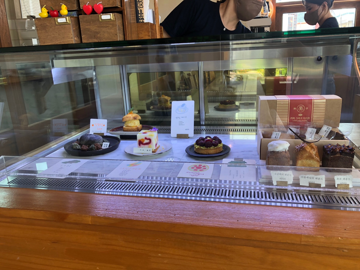 같이 방문한 일행들이 디저트를 별로 좋아하지 않아서 먹지 않았는데 맛이 궁금해지긴 합니다. ㅎㅎㅎ 좋아하시는 분들이 가서 꼭 먹어봐 주세요 ㅎㅎ 컬러도 그렇고 모양도 그렇고 하나하나 아트 같았어요. 가장 왼쪽에 있는 몽돌을 표현한 디저트가 가장 유명한 것 같더라고요! 거제가 몽돌해변이 워낙 많고 유명해서 그것에 포인트를 두고 개발하신 것 같아요.