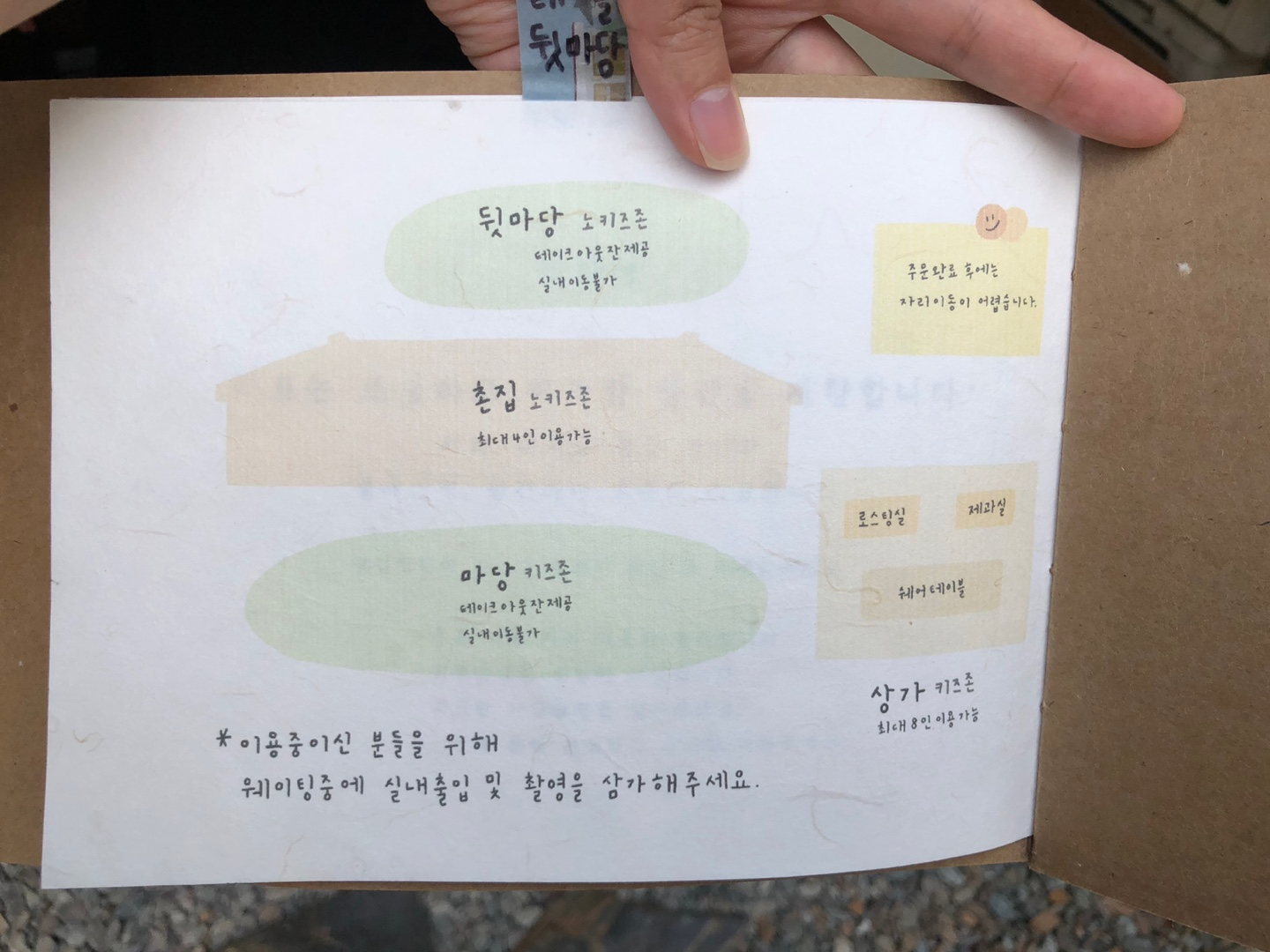리묘는 옛날 집 감성을 그대로 가지고 개조가 되어있어서 공간이 독특하게 나눠져요. 원하는 자리에 앉으면 그 자리에 있는 메뉴판에 공간 설명도 자세하게 나와있었습니다. 앞마당, 뒷마당, 촌집 어디든 원하는 감성에 맞춰서 자리를 고르시면 될 것 같아요. ㅎㅎ 다만 촌집에는 2명이 앉는 자리가 많아서 4인 이상은 자리 잡기가 어렵다는 점 참고해 주세요.