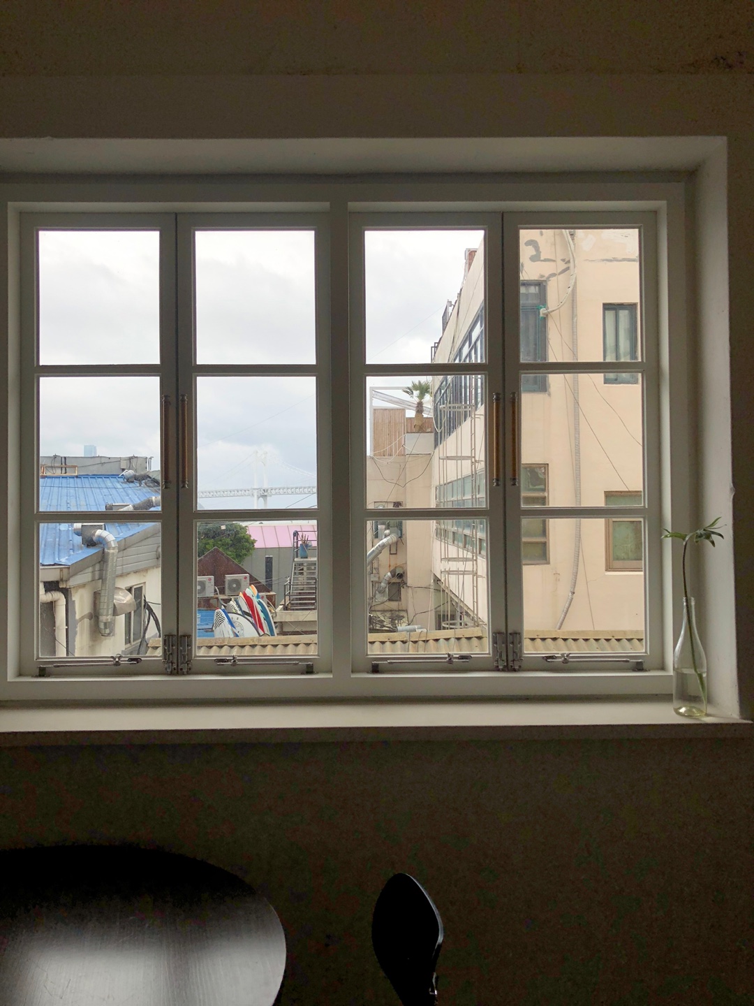 매장 분위기가 깔끔하지만 식물이 많이 있어 편안한 느낌을 함께 주고, 특히 격자무늬 창이 너무 예쁘더라고요. 어딘가 유럽 카페가 연상되는 그런 창문이었습니다. 물론 창 밖은 너무나 한국이지만, 그 장면도 멋져요. 밖으로 광안대교와 바다도 아주 살짝 보여요.