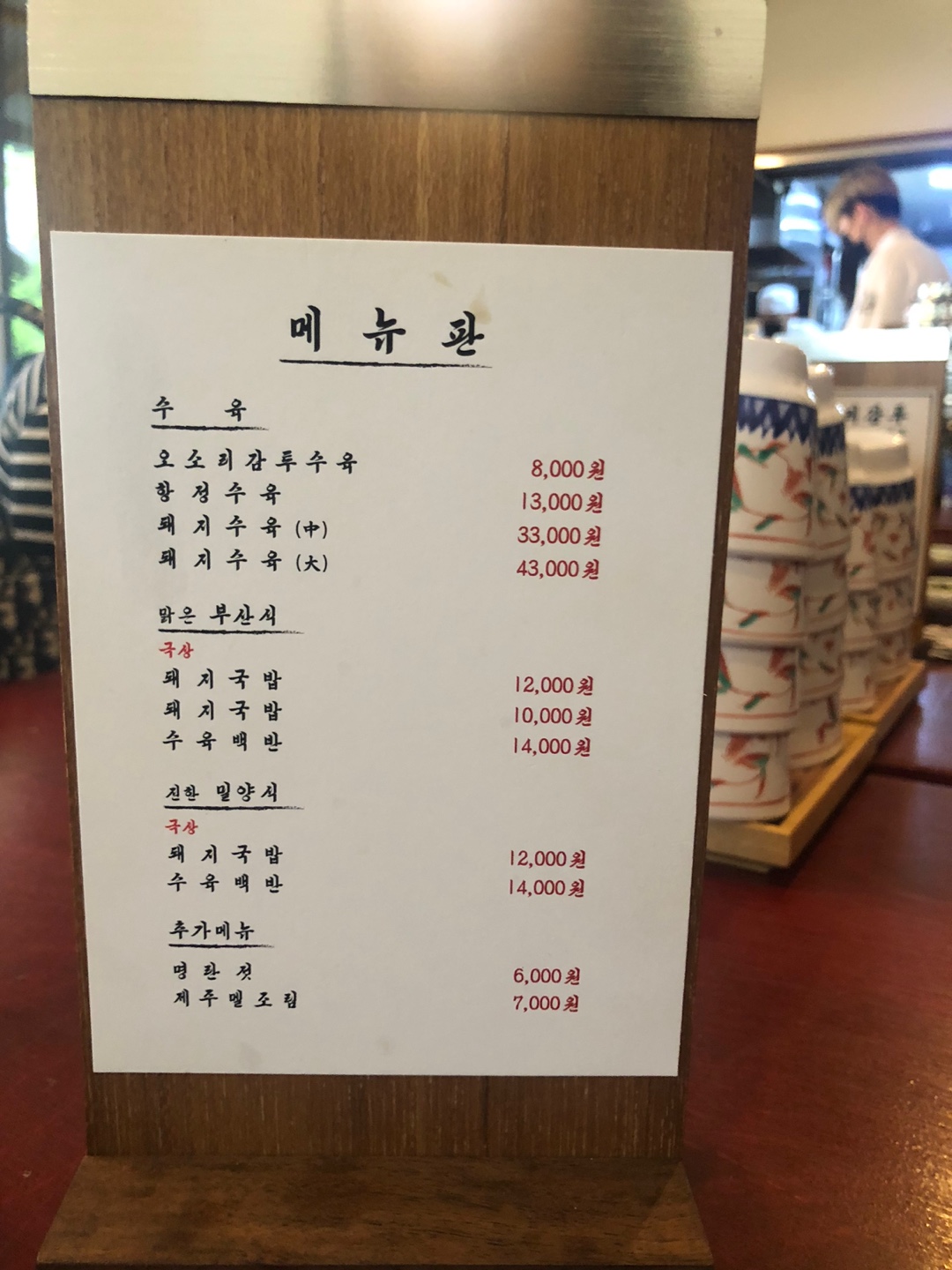 돼지국밥집이라 메뉴는 심플합니다! 한 가지 특이한 것은 부산식 밀양 식이 나눠져 있는데요, 그 차이는 또 설명이 잘 나와있더라고요.