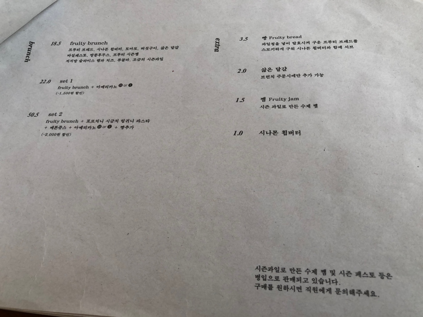 음료는 아메리카노와 프루티의 시그니처 메뉴?라고 생각되는 멜론 주스를 주문했고 음식은 포르치니 시금치 링귀니 파스타와 더치 베이비를 주문했는데 제가 더치베이비 페이지를 안 찍었나 봐요..ㅎㅎㅎ