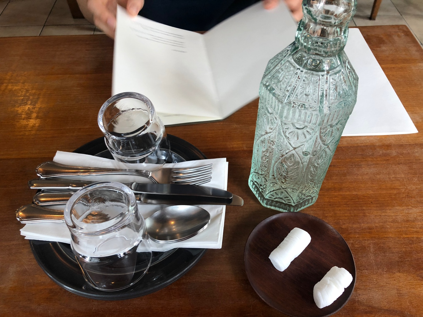자리에 앉으니 물과 커트러리 물수건 등 기본 세팅이 나왔어요. 물이 담긴 유리병이 굉장히 고급스럽고 예쁘지 않나요? ㅎㅎ 묵직한 유리병이랍니다. 그리고 메뉴를 열심히 정독해 봅니다. 정독을 하지만 항상 시키는 메뉴 1가지는 정해져 있고요...ㅎㅎㅎㅎㅎ