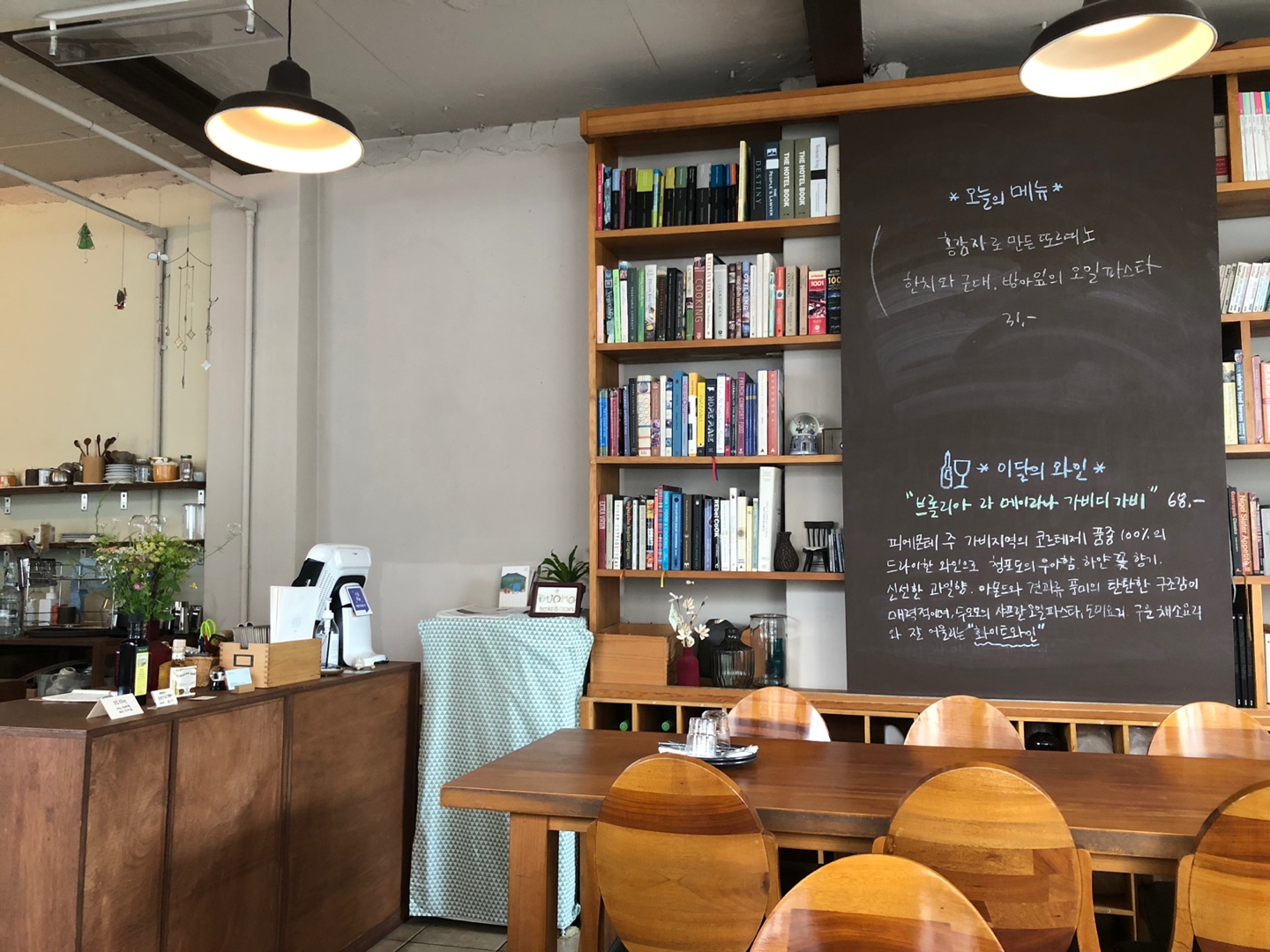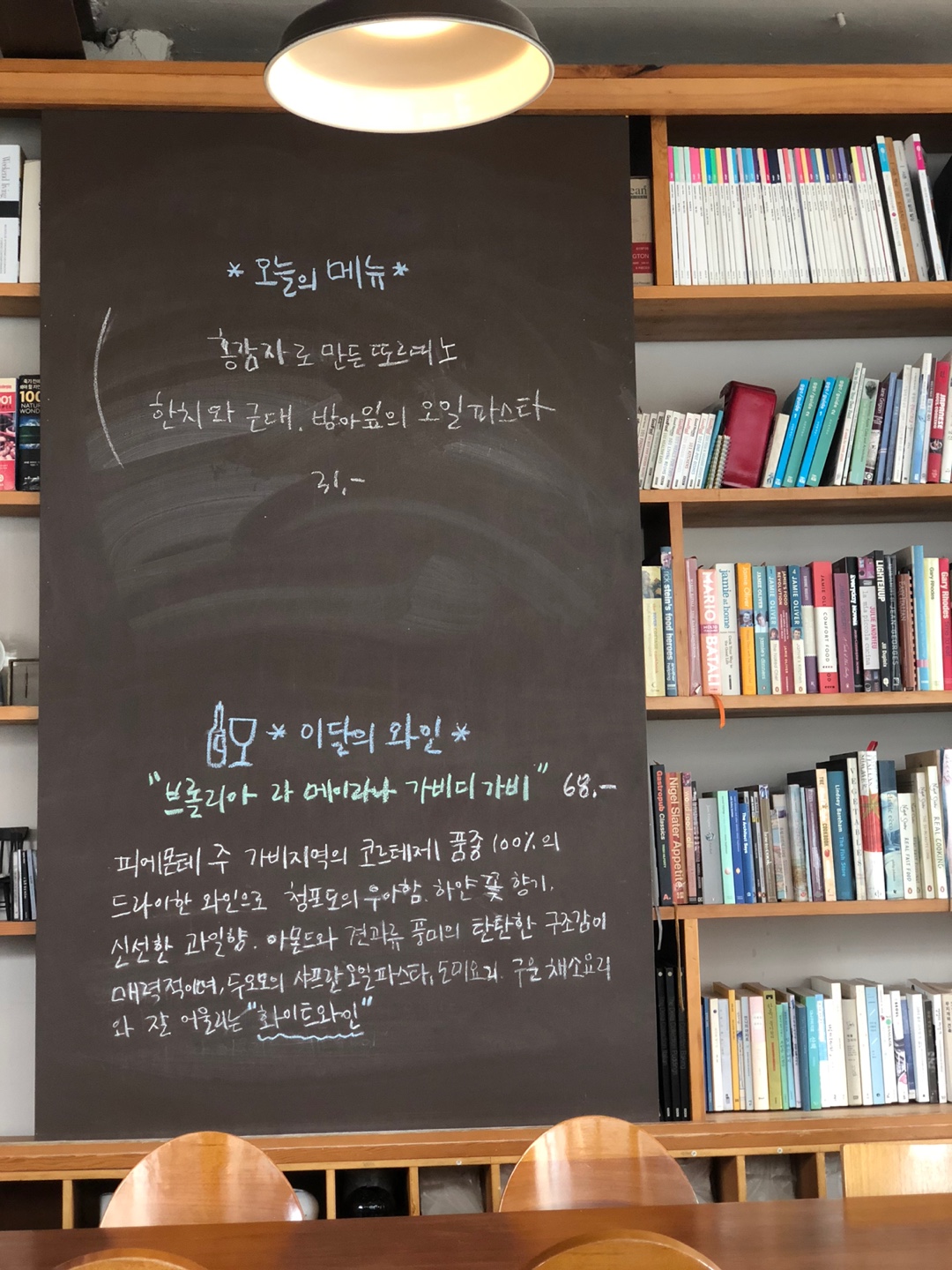 두오모는 메뉴판에 있는 기본 메뉴에 항상 오늘의 메뉴가 추가로 준비되고 있습니다. 책꽂이 앞 커다란 칠판에 오늘의 메뉴를 항상 적어놔 주시고요, 추가로 이달의 와인도 소개되어 있으니 와인 좋아하시는 분들도 눈여겨보시면 좋을 것 같습니다. 한치와 방아잎 근대..? 먹어보지 못한 조합에 이끌려 저는 오늘의 메뉴를 주문하게 되었습니다.