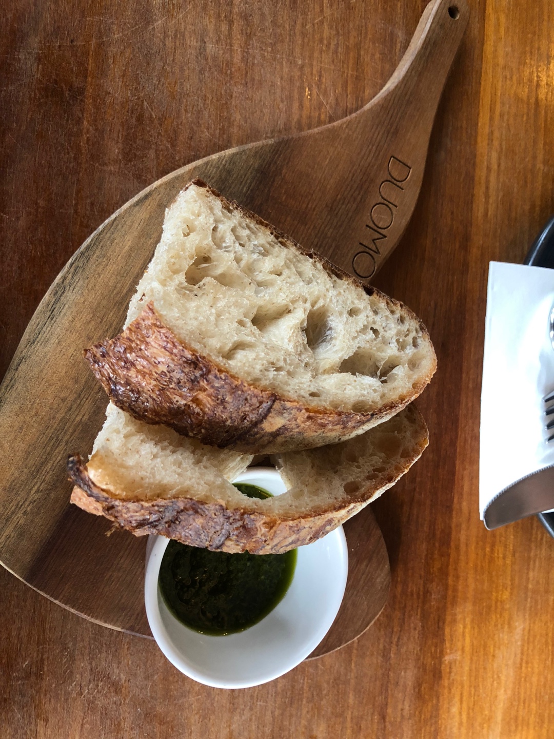 식전 빵은 독특하게 올리브 오일이나 버터가 아닌 바질 페스토와 함께 서브가 되는데요, 새콤한 맛과 함께 향긋한 향도 함께 느낄 수 있어서 독특하고 좋더라고요. ㅎㅎ 빵도 따뜻하게 나와서 소스 찍어서 촵촵 먹으면... 뭐... 말이 필요 없지요. ㅎㅎㅎ