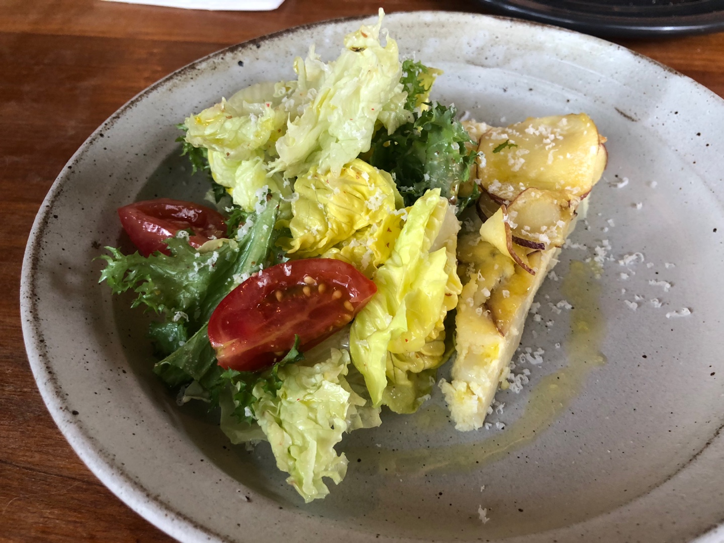 오늘의 메뉴에 포함되어있는 사이드인데요, 약간의 샐러드와 함께 곁들여서 나오는데요 약간 감자 팬케이크 같기도 한데 씹을수록 감자의 고소함과 부드러움이 느껴져서 좋았고 샐러드는 소스가 막 특별한 건 아니지만 상큼하니 좋았습니다.